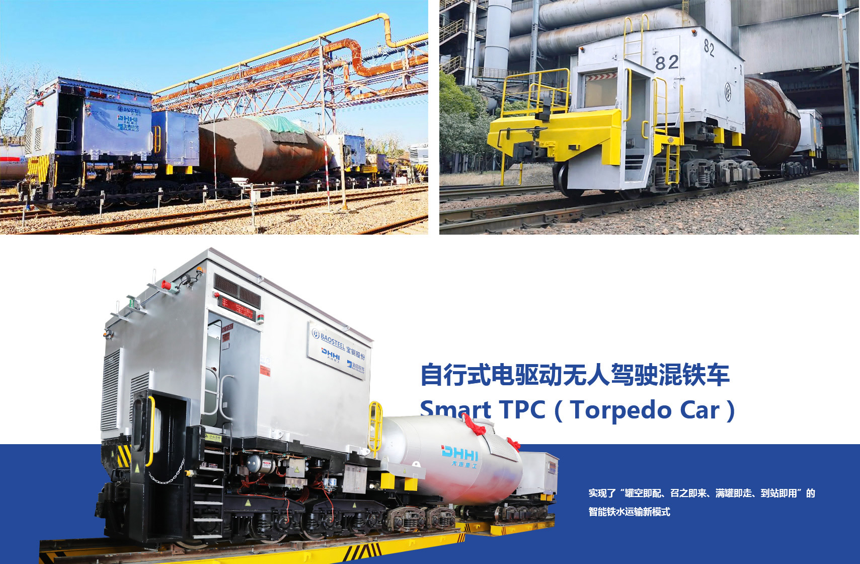 自行式電驅(qū)動(dòng)無(wú)人駕駛混鐵車(chē)Smart TPC(Torpedo Car)是一種綠色、智能、高效的鐵水運(yùn)輸設(shè)備,采用自動(dòng)駕駛,純電力驅(qū)動(dòng),實(shí)現(xiàn)了“罐空即配、召之即來(lái)、滿罐即走、到站即用”的智能鐵水運(yùn)輸新模式,可智能、綠色、高效地完成從高爐到煉鋼的鐵水運(yùn)輸作業(yè)。