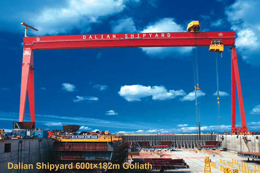 造船門式起重機(jī)是一種大起重量、大跨度,多功能、高效率的門式起重機(jī),專用于船塢或船臺進(jìn)行大型船體分段、對接及翻轉(zhuǎn)作業(yè)。 大連重工自1999年研制出全變頻調(diào)速造船門式起重機(jī)以來,積累了豐富的機(jī)電設(shè)計、結(jié)構(gòu)分析計算、制造、運(yùn)輸、安裝和調(diào)試經(jīng)驗(yàn),形成了自主的核心技術(shù),至今已研制了200—800噸等不同規(guī)格的造船門式起重機(jī)。
