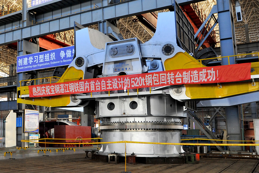 大包轉(zhuǎn)臺(tái)安裝在連鑄車間鋼水接受跨和連鑄跨之間的澆鑄平臺(tái)上,用于接受煉鋼系統(tǒng)送來(lái)的盛滿鋼水的鋼包,將鋼包轉(zhuǎn)至連鑄跨的澆注位置進(jìn)行澆注。大連重工研制的大包轉(zhuǎn)臺(tái)產(chǎn)品單臂承載能力從42噸到520噸,尤其是大噸位(大于200噸)鋼包回轉(zhuǎn)臺(tái)國(guó)內(nèi)市場(chǎng)占有率很高,產(chǎn)品功能從單一回轉(zhuǎn)型發(fā)展到多功能型。
